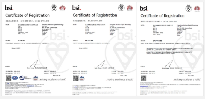 近日,海康威視正式獲得由國際**標(biāo)準(zhǔn)研發(fā)和認(rèn)證評審機(jī)構(gòu)英國標(biāo)準(zhǔn)協(xié)會(huì)(BSI)頒發(fā)的ISO/IEC 27701:2019及ISO/IEC 29151:2017體系認(rèn)證,意味著海康威視所建立的隱私信息管理···